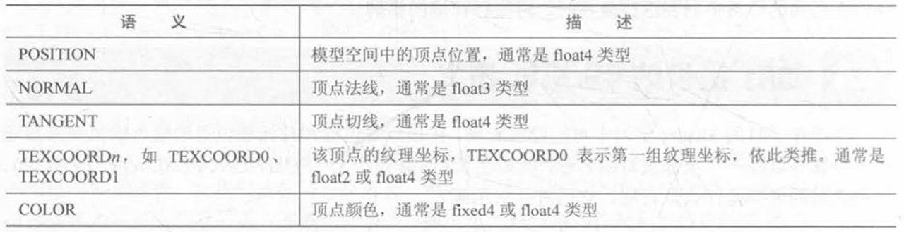 ==读者有时可能会看到同一个变量在不同的 Shader 里面使用了不同的语义修饰。例如,一些 Shader 会使用 POSITION 而非 SV_POSITION 来修饰顶点着色器的输出。SV_POSITION 是 DirectX 10 中引入的系统数值语义,在绝大多数平台上,它和 POSITION 语义是等价的,但在某些平台(例如索尼 PS4)上必须使用 SV_POSITION 来修饰顶点着色器的输出,否则无法让 Shader 正常工作。同样的例子还有 COLOR 和 SV_Target。因此,为了让我们的 Shader 有更好的跨平台性,对于这些有特殊含义的变量我们最好使用以 SV 开头的语义进行修饰。==